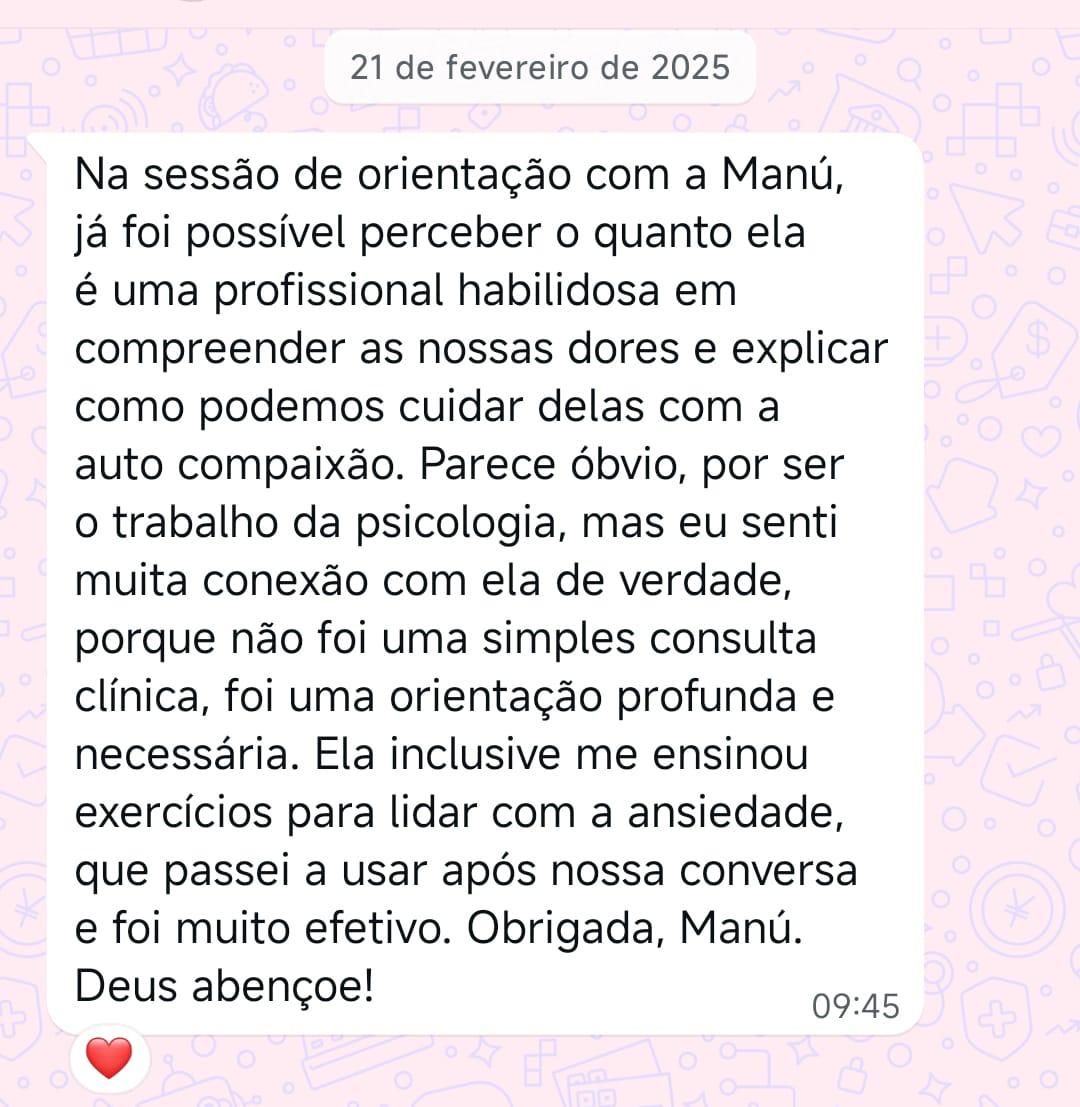 Já realizei mais de 5.000 atendimentos clínicos, acompanhei centenas de mulheres em grupos terapêuticos e ajudei pessoas no Brasil, Estados Unidos, Portugal e Espanha.